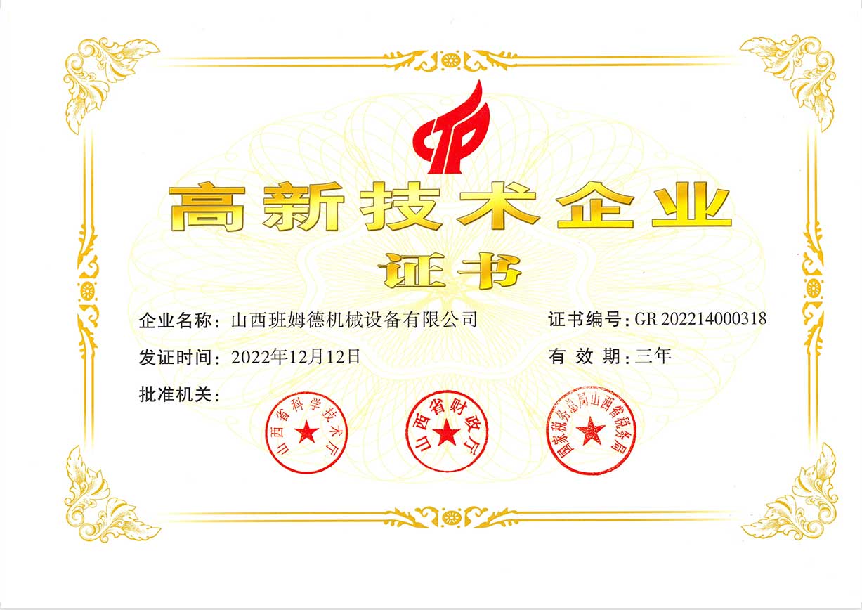 近日,山西班姆德機械設備有限公司獲得由山西省科學技術局等部門聯(lián)合頒發(fā)的“高新技術企業(yè)”認定證書,這是班姆德繼2019年首次獲得高企認定后,再次邁入高新技術企業(yè)行列。