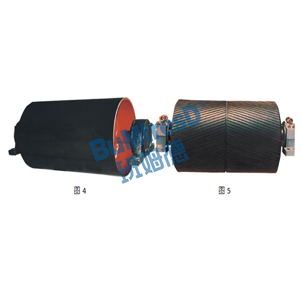 人字形溝槽鑄(包)膠滾筒(如圖5)是在鋼制光面滾筒表面,加一層帶人字溝槽的橡膠層,這樣可以大大增加皮帶和滾筒之間的摩擦系數(shù)。在潮濕環(huán)境中,溝槽能使水的薄膜中斷,不積水,同時(shí)輸送帶與滾筒接觸時(shí),輸送帶表面能擠壓到溝槽里,由于這兩各原因,即使在潮濕的場(chǎng)合工作,摩擦系數(shù)降低也很小。但這種滾筒運(yùn)行方向?yàn)槿俗中畏较颍坏梅聪蜻\(yùn)轉(zhuǎn)。