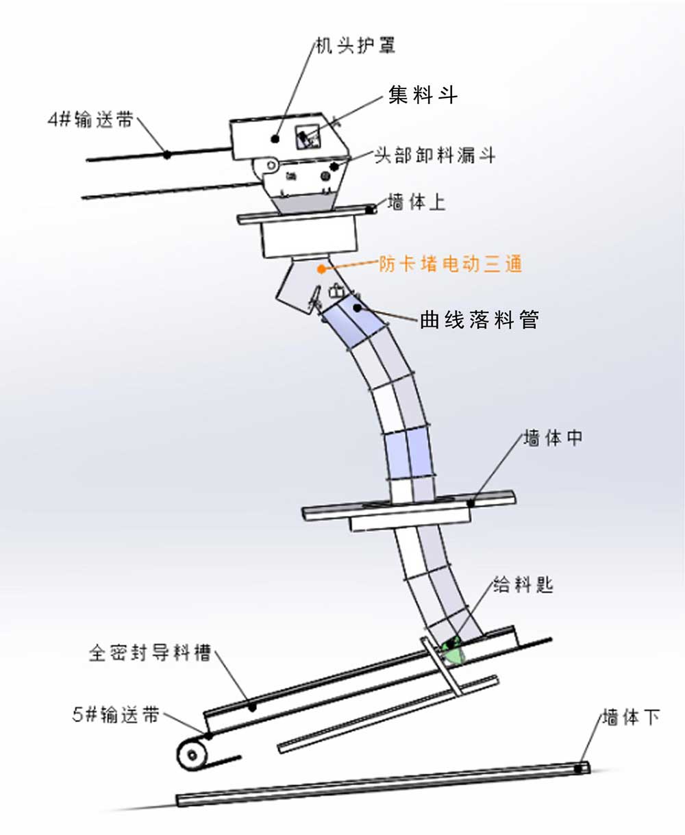 4、曲線落料管截面可采用多邊形設(shè)計(jì),截面為多邊形不僅有效增大腔體截面,更不易積料和堵塞。